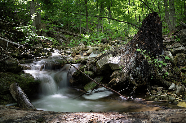 The crystalline water tumbles over the uneven terrain, creating a mesmerizing display of motion and fluidity. As the water descends, it forms a delicate curtain of droplets, casting a fine mist in the air. The cascade's descent is captured in a gentle blur, emphasizing the dynamic movement and energy of the flowing water. The sound of the cascading waterfall harmonizes with the symphony of the forest, creating a soothing melody that resonates through the surroundings.